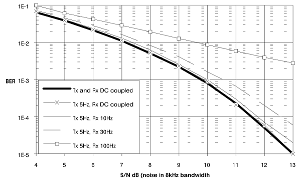The audio signal coming from the radio needs to be AC coupled to the CMX589 device. The image below, from the data sheet, shows that the input signal should be AC coupled with a 20Hz high pass filter. It also shows that the time constant should be shorter than the time constant used on the transmit side.
