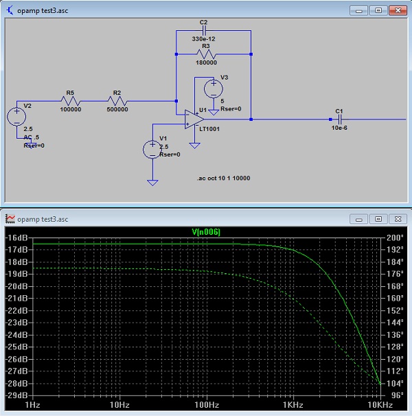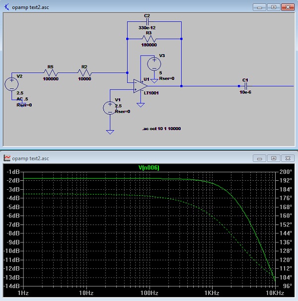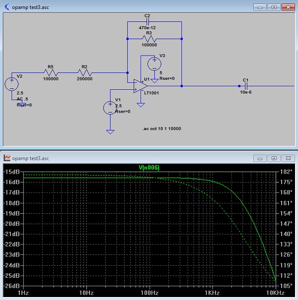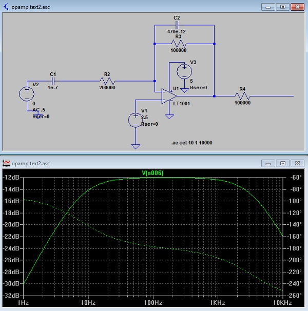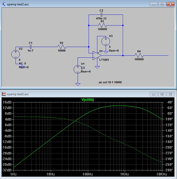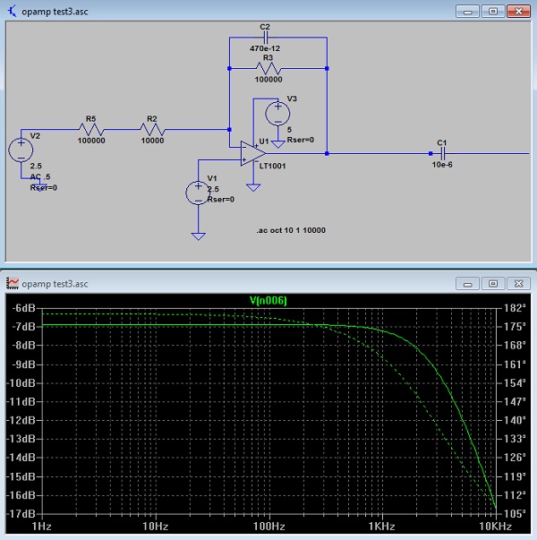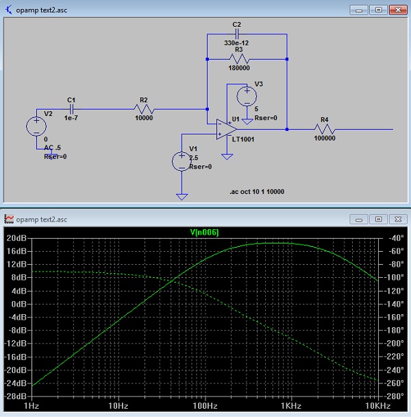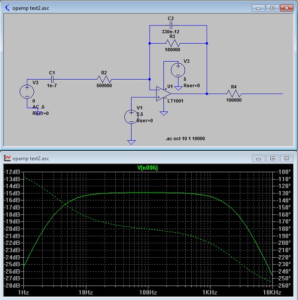 To better understand how well the various op-amp designs work, we ran them through a Spice simulator. After looking at the results it appears that the high frequency cutoff are too low and need to be a bit higher.To quote from the Linear Technologies website: "LTspice IV is a high performance SPICE simulator, schematic capture and waveform viewer with enhancements and models for easing the simulation of switching regulators." LTSpice IV is a free download from the Linear website: LTSpice IV